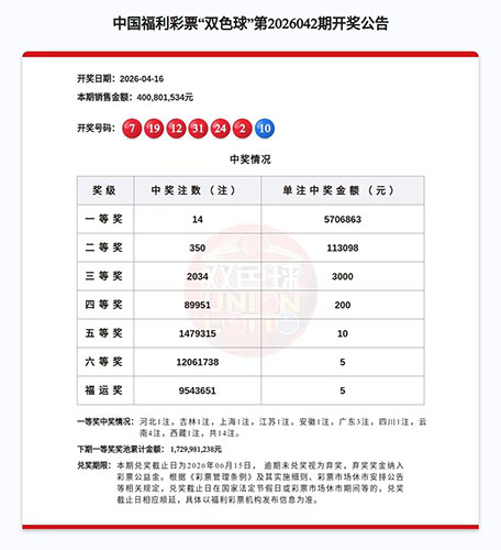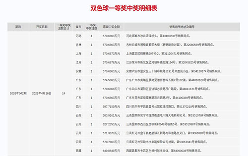 4月16日晚,双色球第2026042期开奖,开出红球号码2、7、12、19、24、31,蓝球号码10。当期全国一等奖中出14注,单注奖金570余万元。出自新北区孟河镇环镇北路第32045825号福彩销售网点的一张双色球彩票中得1注一等奖、2注六等奖和1注福运奖,票面合计奖金为570.6878万元。